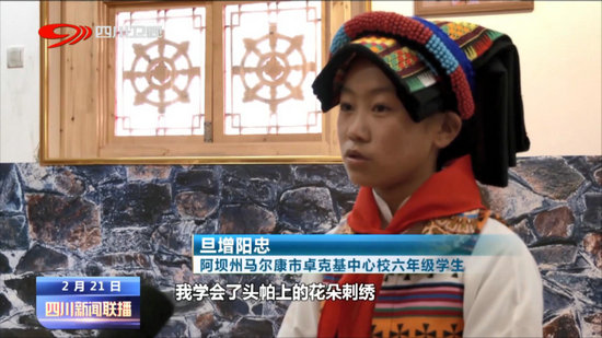 阿壩州馬爾康市卓克基中心校六年級學生 旦增陽忠:我學會了頭帕上的花朵刺繡,以后我還想傳承嘉絨刺繡文化,這樣我對家鄉(xiāng)的文化更加自信。