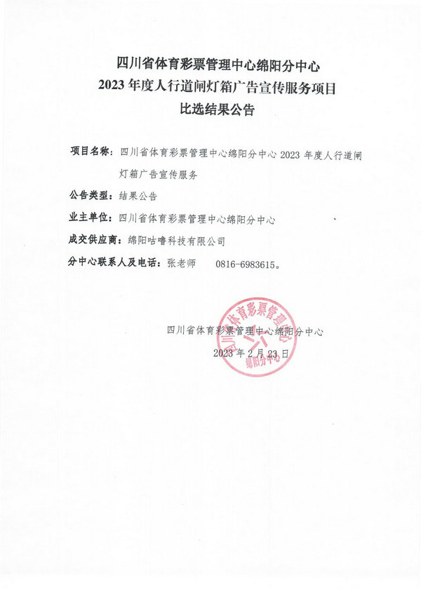 四川省體育彩票管理中心綿陽分中心2023年度人行道閘燈箱廣告宣傳服務(wù)項目比選結(jié)果公告