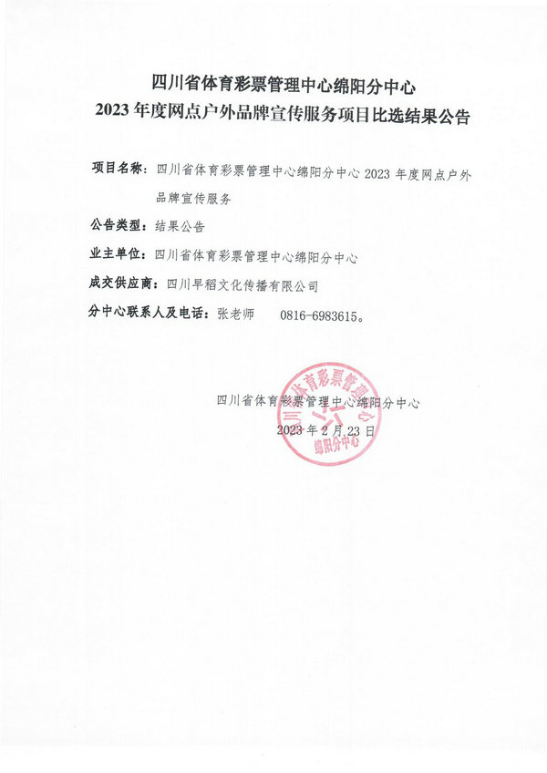 四川省體育彩票管理中心綿陽分中心2023年度網點戶外品牌宣傳服務項目比選結果公告