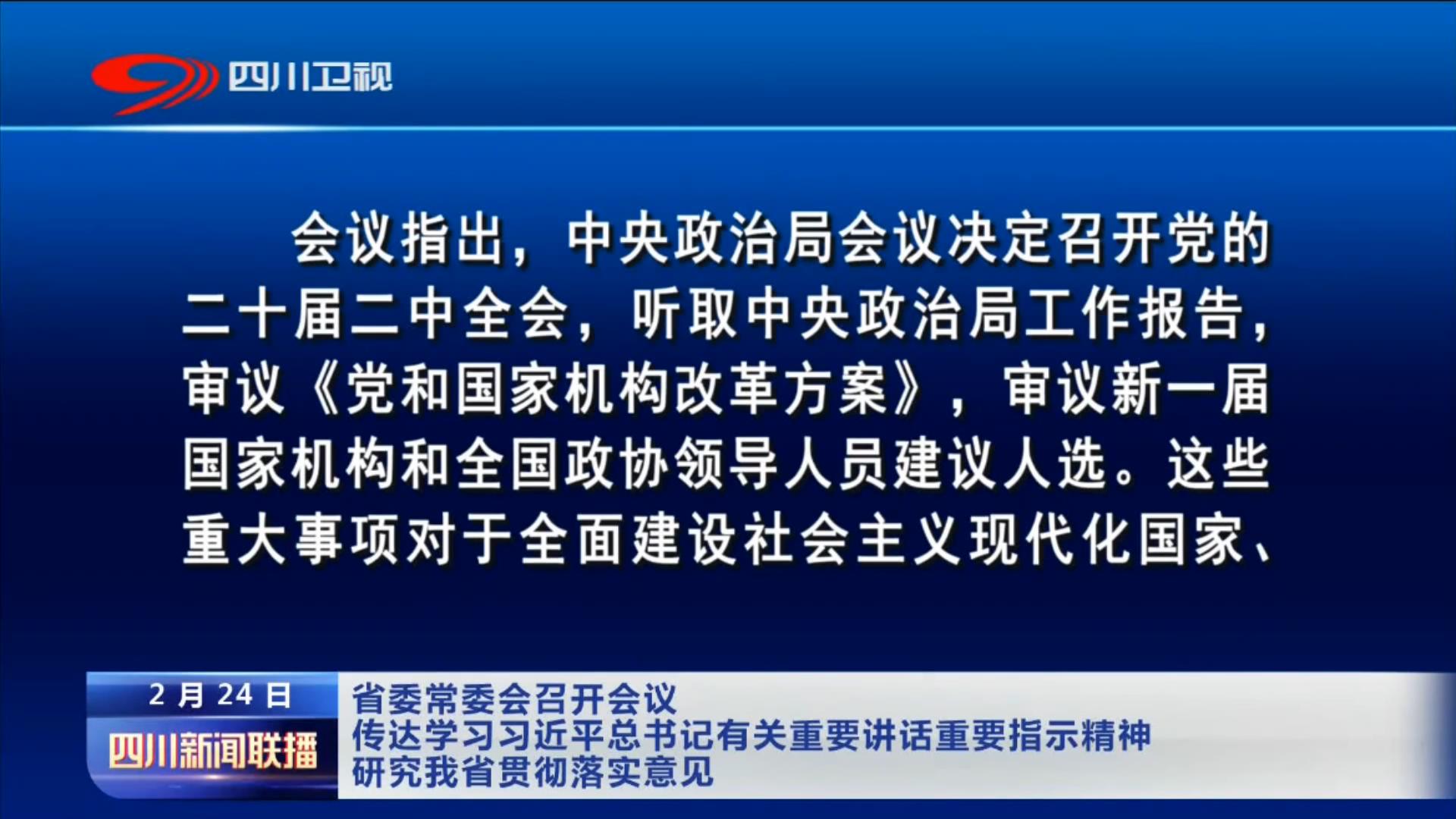 會議指出,中央政治局會議決定召開黨的二十屆二中全會,聽取中央政治局工作報告,審議《黨和國家機構(gòu)改革方案》,審議新一屆國家機構(gòu)和全國政協(xié)領(lǐng)導(dǎo)人員建議人選。這些重大事項對于全面建設(shè)社會主義現(xiàn)代化國家、全面推進(jìn)中華民族偉大復(fù)興具有重要而深遠(yuǎn)的意義。全省上下要準(zhǔn)確把握黨的二十屆二中全會的重大意義,深刻領(lǐng)會黨中央重大決策的核心要義和戰(zhàn)略考量,切實把思想和行動統(tǒng)一到黨中央決策部署上來。要準(zhǔn)確把握黨中央關(guān)于黨和國家機構(gòu)改革的重大部署,堅定擁護(hù)中央決定,堅決執(zhí)行中央要求,以推進(jìn)改革的實際行動檢驗“四個意識”、踐行“兩個維護(hù)”。要準(zhǔn)確把握黨中央關(guān)于做好今年政府工作的重要要求,圍繞四川現(xiàn)代化建設(shè)的“總牽引、總抓手、總思路”,抓緊抓實各項重點工作,加強政府自身建設(shè),綜合施策推動經(jīng)濟運行整體好轉(zhuǎn),努力完成全年目標(biāo)任務(wù)。