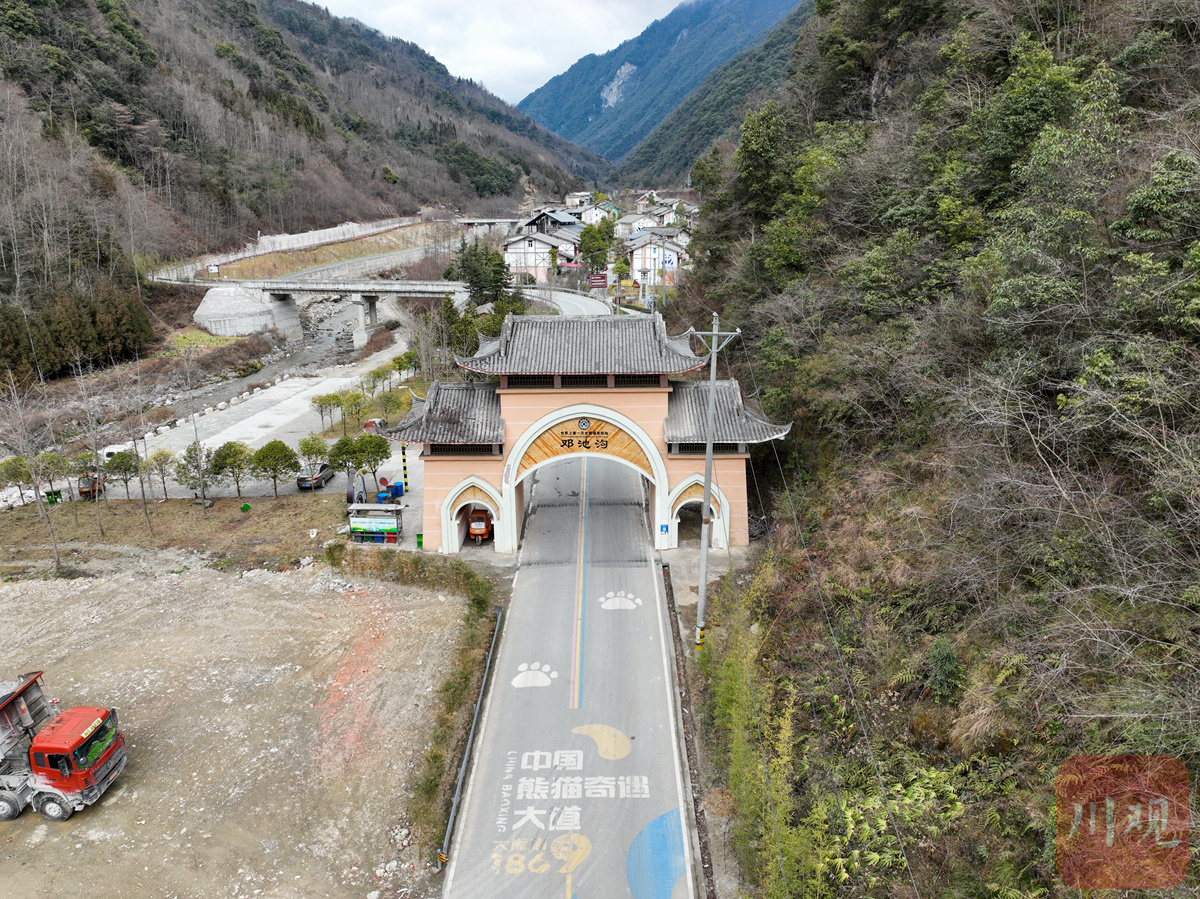 從寶興縣城出發(fā),沿著“中國熊貓奇遇大道”前往鄧池溝村,一路山巒疊嶂,草木蔥蘢,路邊不時(shí)出現(xiàn)大熊貓?jiān)煨偷氖蘸偷榔臁ER近村口,一座大型“熊貓拱門”上,醒目的大字提醒游客,這里是“世界大熊貓文化發(fā)祥地”。