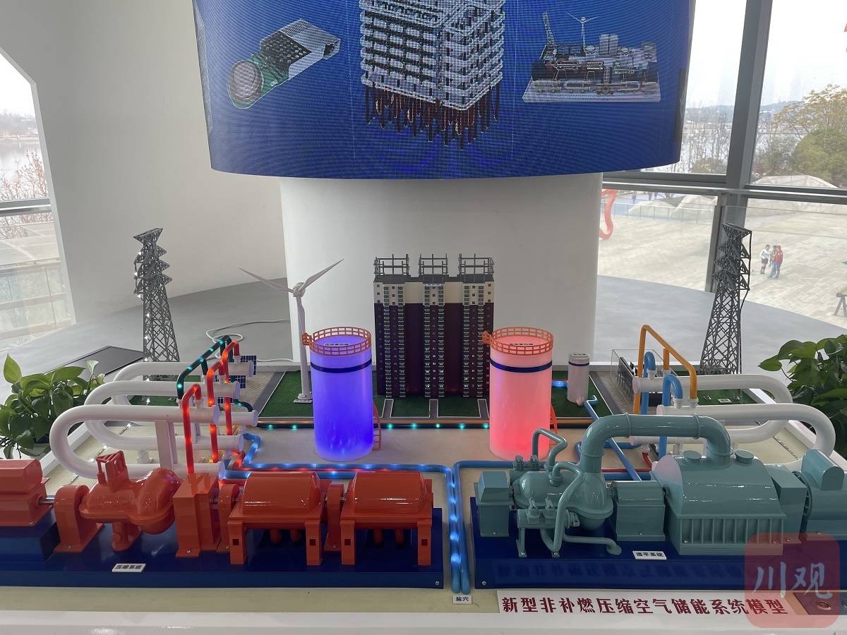 在清華四川能源互聯(lián)網(wǎng)研究院一樓的成果展示廳內(nèi),一套特別的儲能發(fā)電裝置模型引起大家注意。這套裝置的地上設(shè)備和一般的大型機械類似,特別之處在它的地下部分。“這是一種新型的壓縮空氣儲能裝備。”清華四川能源互聯(lián)網(wǎng)研究院院長助理、科技創(chuàng)新部主任呂嵐春介紹,地下部分就是儲存壓縮空氣的地方,特別在于它并非重新挖掘的,而是利用已經(jīng)存在的“鹽穴”。
