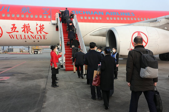 四川代表團代表從成都啟程乘機前往北京參加全國兩會。鐘德波 攝