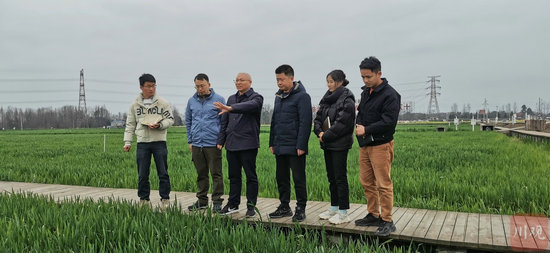 吳德(左3)在崇州十萬畝糧油基地調(diào)研學(xué)校小麥高產(chǎn)示范片情況。