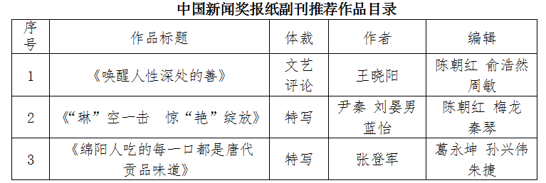 根據(jù)《中國新聞獎評選辦法》規(guī)定的程序,經(jīng)民主推薦及評委會評議,綿陽日報社擬推薦以下3件作品參加報紙副刊作品的初評,現(xiàn)予以公示。公示期為3月27日至31日。如有異議,可通過書面、電話方式,于3月31日17時前進行反映。