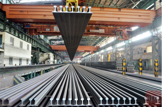 100米長(zhǎng)定尺鋼軌生產(chǎn)現(xiàn)場(chǎng)。