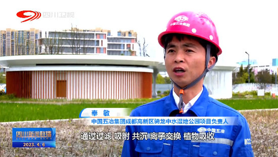中國(guó)五冶集團(tuán)成都高新區(qū)騎龍中水濕地公園項(xiàng)目負(fù)責(zé)人 奉敏:從凈水廠凈化后的Ⅳ(四)類尾水,經(jīng)管網(wǎng)均勻地進(jìn)入我們這個(gè)濕地凈水系統(tǒng),通過(guò)過(guò)濾、吸附、共沉、離子交換、植物吸收和微生物的分解等作用,達(dá)到Ⅲ(三)類尾水(標(biāo)準(zhǔn)) 最終排入我們的黃堰河。