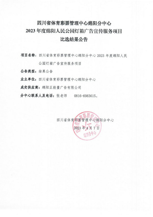 四川省體育彩票管理中心綿陽分中心2023年度綿陽人民公園燈箱廣告宣傳服務(wù)項(xiàng)目比選結(jié)果公告