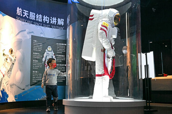 2023年1月7日,一名兒童在國家海洋博物館參觀“探索·星辰大海──航天科技主題成果巡回展”。新華社記者 趙子碩 攝