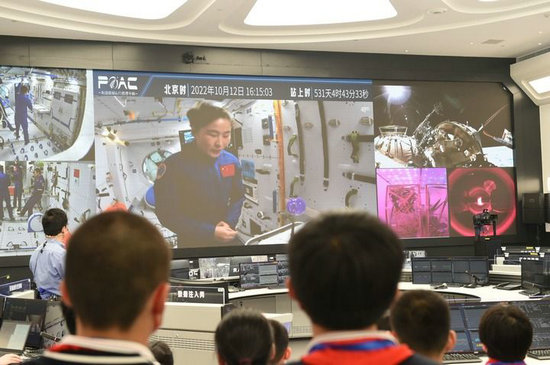 2022年10月12日,在中科院空間應(yīng)用工程與技術(shù)中心地面主課堂,學(xué)生收看“天宮課堂”第三課。新華社記者 羅曉光 攝