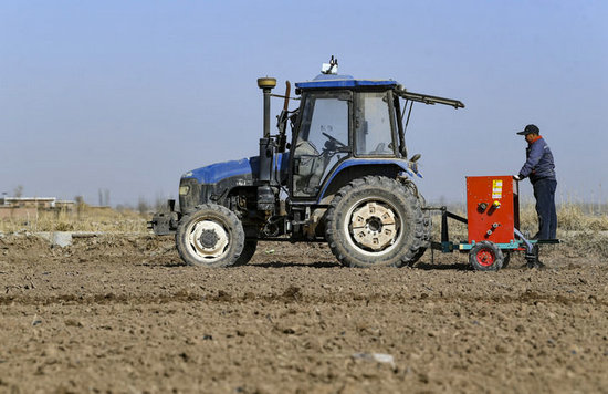 2023年3月3日,在寧夏銀川市賀蘭縣立崗鎮(zhèn)銀星村,一臺(tái)裝有北斗導(dǎo)航系統(tǒng)的無人駕駛播種機(jī)進(jìn)行播種作業(yè)。新華社記者 馮開華 攝