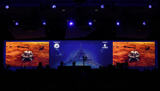 這是2022年9月21日在法國巴黎拍攝的天問一號(hào)火星探測(cè)團(tuán)隊(duì)成果介紹會(huì)現(xiàn)場(chǎng)。新華社記者 高靜 攝