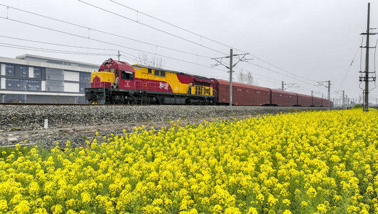 2023年3月16日,成都國(guó)際鐵路港周邊的油菜花競(jìng)相綻放,春意盎然。一列列火車(chē)穿行其中,猶如“開(kāi)往春天的列車(chē)”。 白桂斌 攝