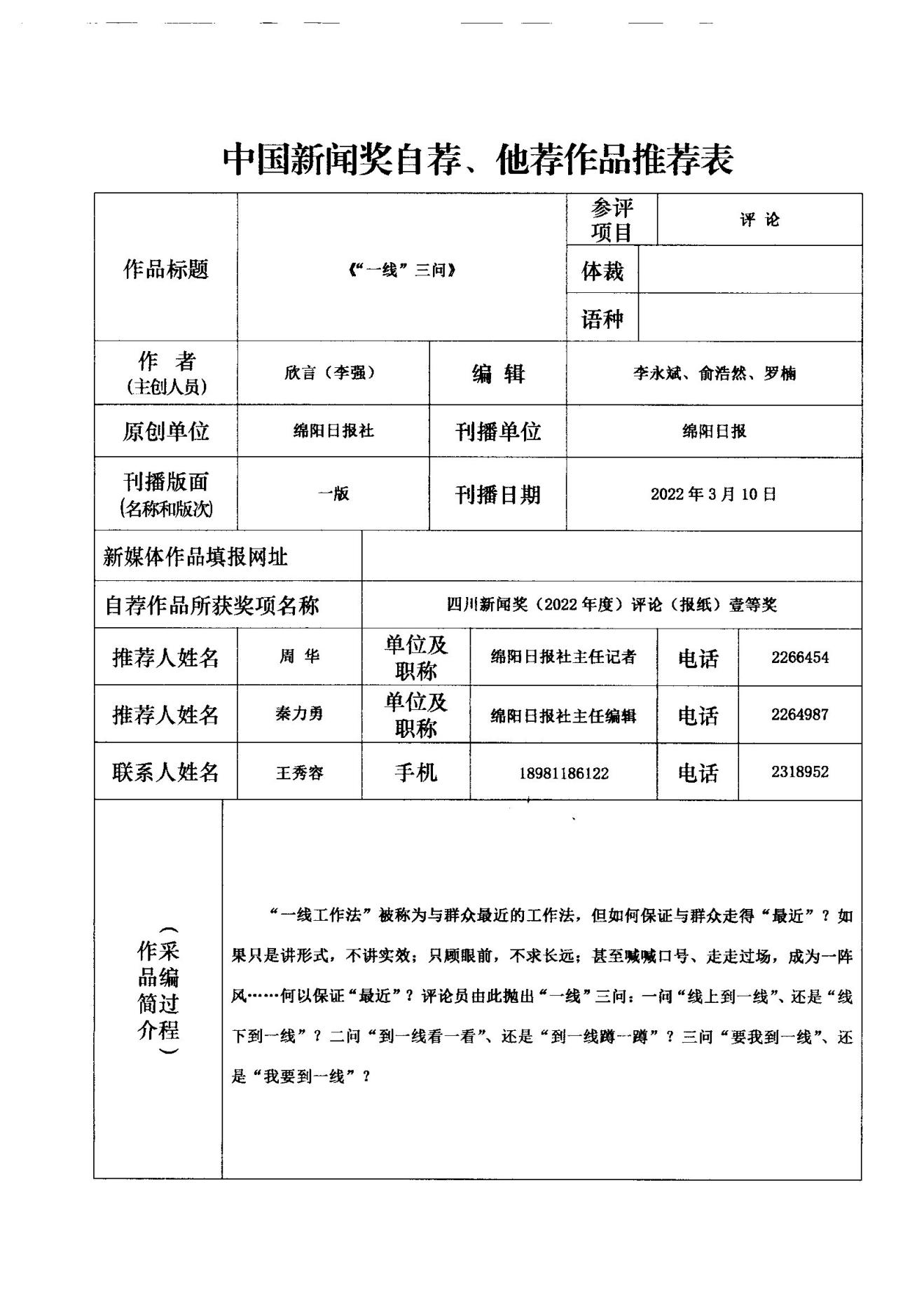 根據(jù)《中國(guó)新聞獎(jiǎng)評(píng)選辦法》和《第33屆中國(guó)新聞獎(jiǎng)參評(píng)作品報(bào)送通知》,由綿陽日?qǐng)?bào)社記者李強(qiáng)撰寫,李永斌、俞浩然、羅楠編輯的評(píng)論作品《“一線”三問》擬自薦參評(píng)第33屆中國(guó)新聞獎(jiǎng)?,F(xiàn)將作品相關(guān)信息進(jìn)行公示,公示期為5天。在此期間,如有異議,可通過電話、郵件等方式反映。