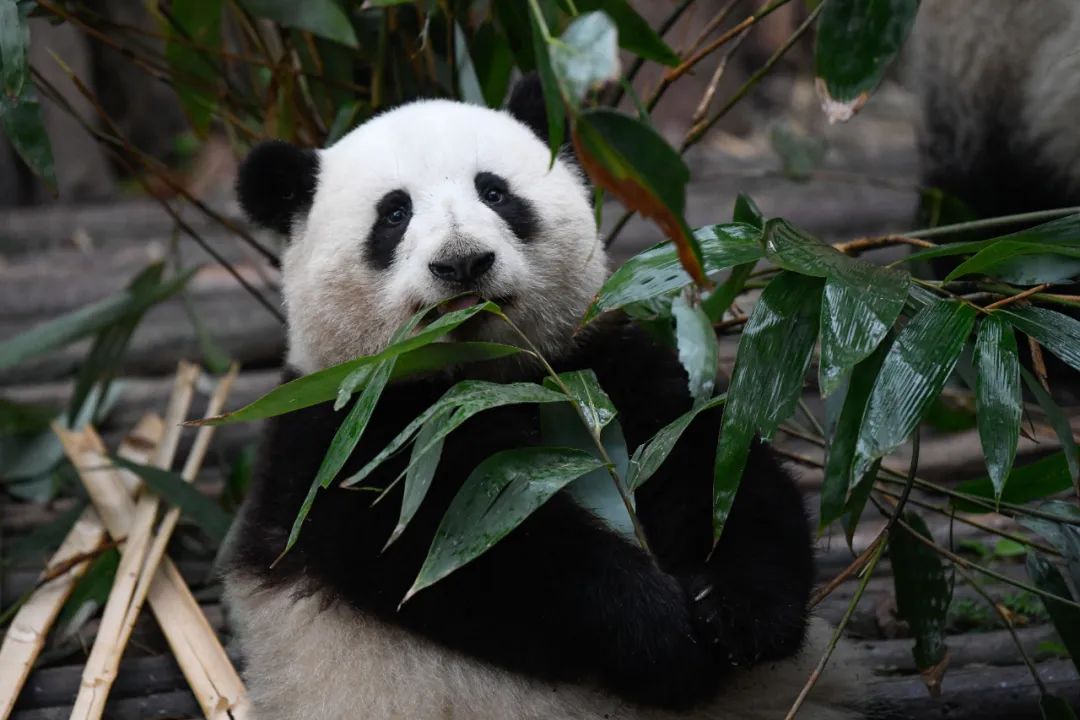 資料圖:在成都大熊貓繁育研究基地,大熊貓“和花”在吃竹子。新華社記者 胥冰潔 攝