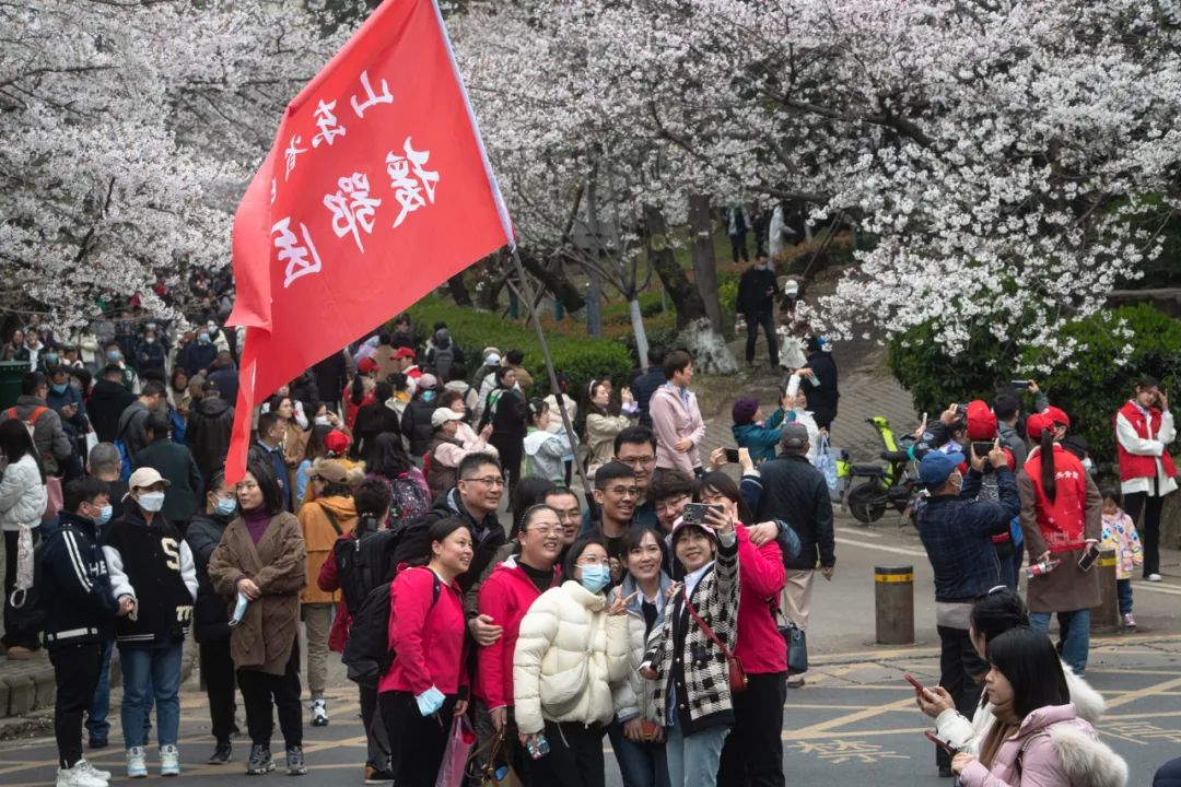 資料圖:山東省日照市援鄂醫(yī)療隊員在武漢大學校園櫻花樹下合影。新華社記者 肖藝九 攝