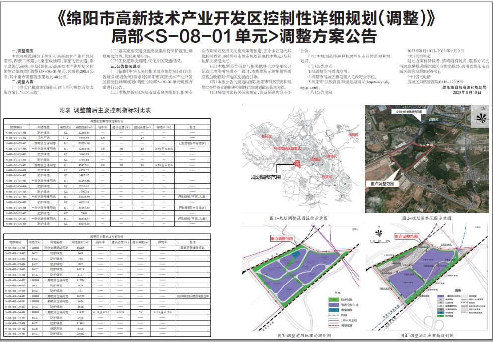 《綿陽市高新技術產(chǎn)業(yè)開發(fā)區(qū)控制性詳細規(guī)劃(調(diào)整)》 局部(S-08-01單元)調(diào)整方案公告