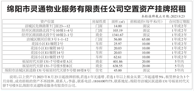綿陽市靈通物業(yè)服務(wù)有限責(zé)任公司空置資產(chǎn)掛牌招租