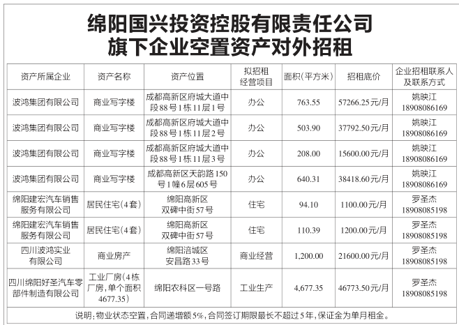 綿陽國興投資控股有限責(zé)任公司旗下企業(yè)空置資產(chǎn)對外招租