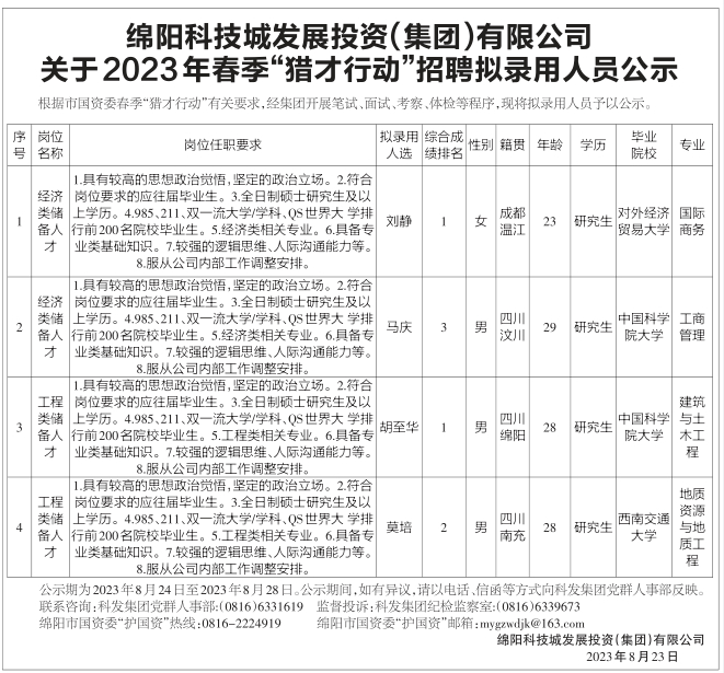 綿陽科技城發(fā)展投資(集團(tuán))有限公司關(guān)于2023年春季“獵才行動”招聘擬錄用人員公示