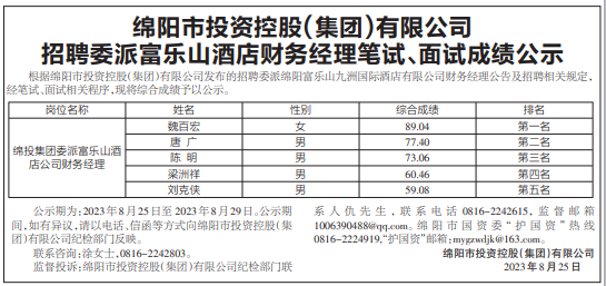 綿陽市投資控股(集團)有限公司招聘委派富樂山酒店財務(wù)經(jīng)理筆試、面試成績公示
