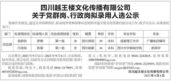 四川越王樓文化傳播有限公司關(guān)于黨群崗、行政崗擬錄用人選公示