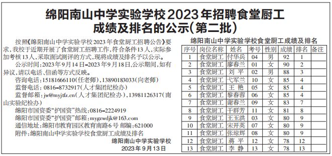 綿陽(yáng)南山中學(xué)實(shí)驗(yàn)學(xué)校2023年招聘食堂廚工成績(jī)及排名的公示(第二批)