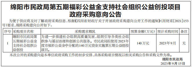 綿陽市民政局第五期福彩公益金支持社會(huì)組織公益創(chuàng)投項(xiàng)目政府采購意向公告