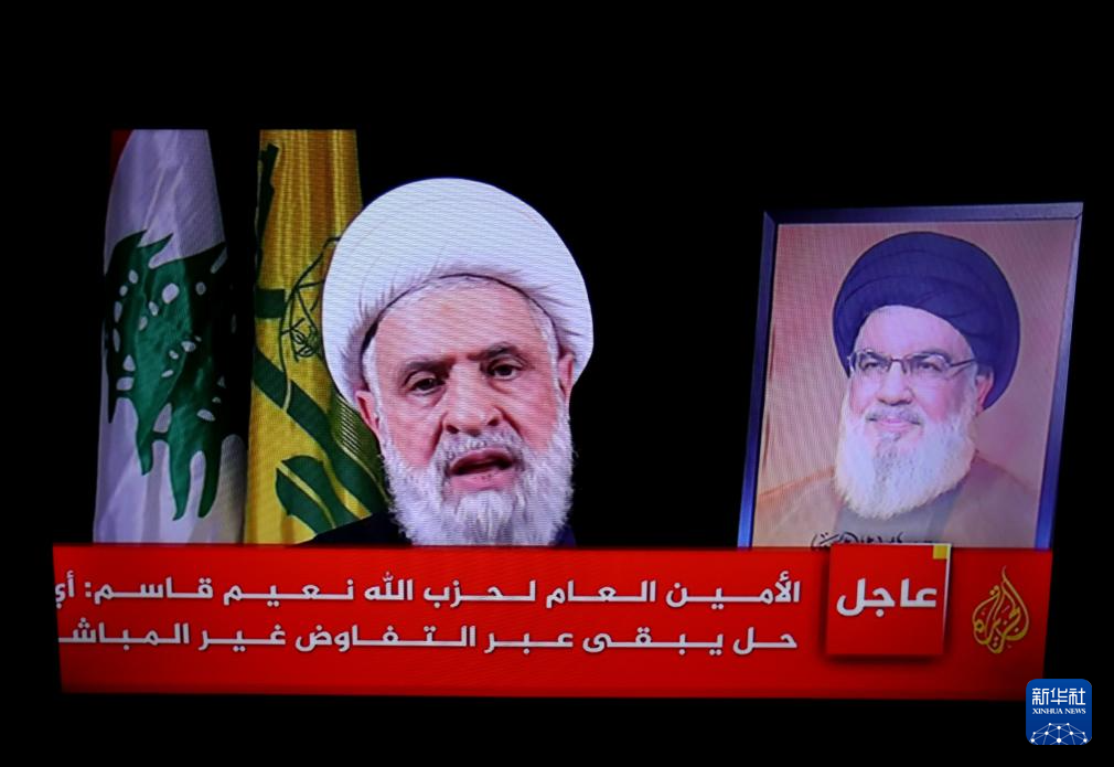 這是10月30日在黎巴嫩首都貝魯特拍攝的黎巴嫩真主黨新任領(lǐng)導(dǎo)人納伊姆·卡西姆發(fā)表講話的電視畫面。新華社發(fā)(比拉爾·賈維希攝)