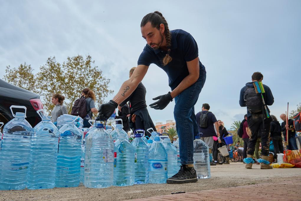11月3日,志愿者在西班牙巴倫西亞市區(qū)分發(fā)物資。新華社發(fā)(巴勃羅·莫拉諾攝)