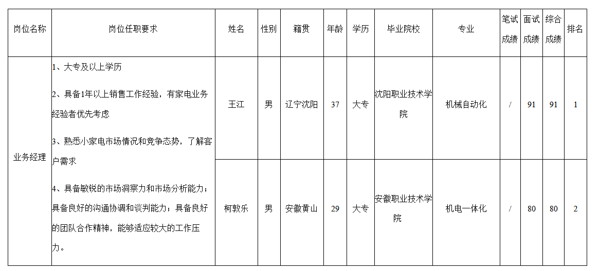 根據(jù)合肥長虹美菱生活電器有限公司發(fā)布的招聘公告及招聘相關(guān)規(guī)定,經(jīng)面試等程序,現(xiàn)將成績予以公示。