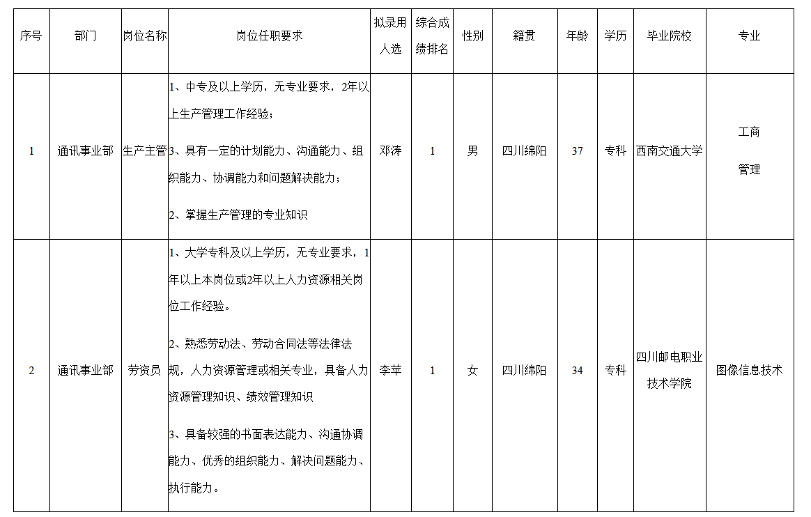 根據(jù)四川華豐科技股份公司發(fā)布的招聘公告及招聘相關(guān)規(guī)定,經(jīng)筆試、面試、考察、體檢等程序,擬錄用鄧濤等同志到四川華豐科技股份有限公司工作,現(xiàn)予以公示,具體情況如下: