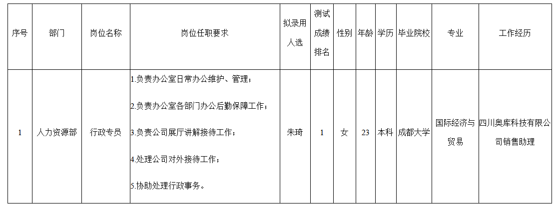 根據(jù)四川啟賽微電子有限公司發(fā)布的招聘公告及招聘相關(guān)規(guī)定,經(jīng)用人單位面試,擬錄用以下同志到相應(yīng)崗位工作,現(xiàn)予以公示,具體情況如下: