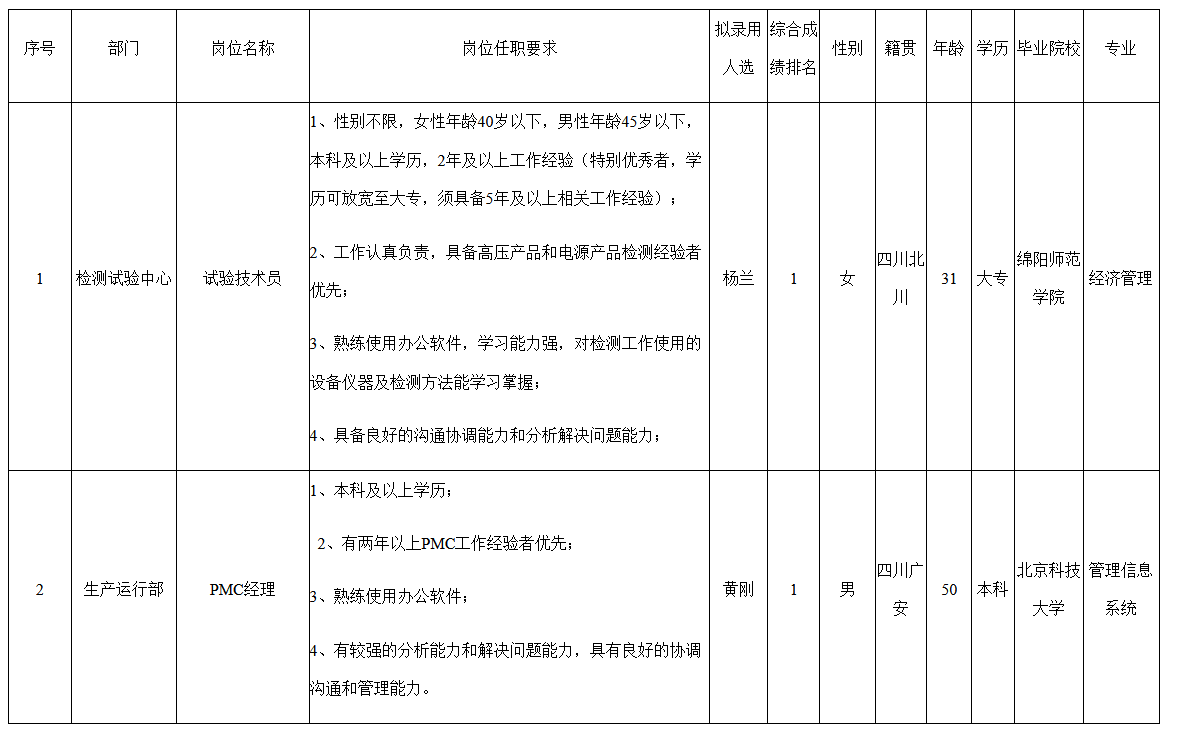 根據(jù)四川長虹電源股份有限公司發(fā)布的招聘公告及招聘相關(guān)規(guī)定,經(jīng)筆試、面試、考察、體檢等程序,擬錄用黃剛、楊蘭2名同志到我司工作,現(xiàn)予以公示,具體情況如下: