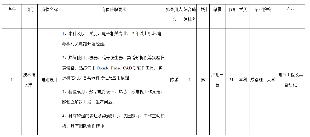 根據(jù)四川長(zhǎng)虹電器股份有限公司(多媒體公司)發(fā)布的招聘公告及招聘相關(guān)規(guī)定,經(jīng)面試、考察、體檢等程序,擬錄用陳誠(chéng)同志到技術(shù)研發(fā)部工作,現(xiàn)予以公示,具體情況如下: