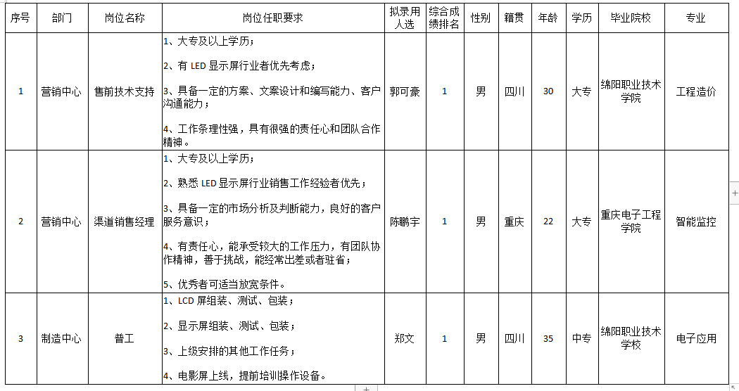 根據(jù)深圳市九州光電科技有限公司發(fā)布的招聘公告及招聘相關(guān)規(guī)定,經(jīng)筆試、面試、考察、體檢等程序,擬錄用郭可豪、陳鵬宇、鄭文三位同志到深圳市九州光電科技有限公司工作,現(xiàn)予以公示,具體情況如下: