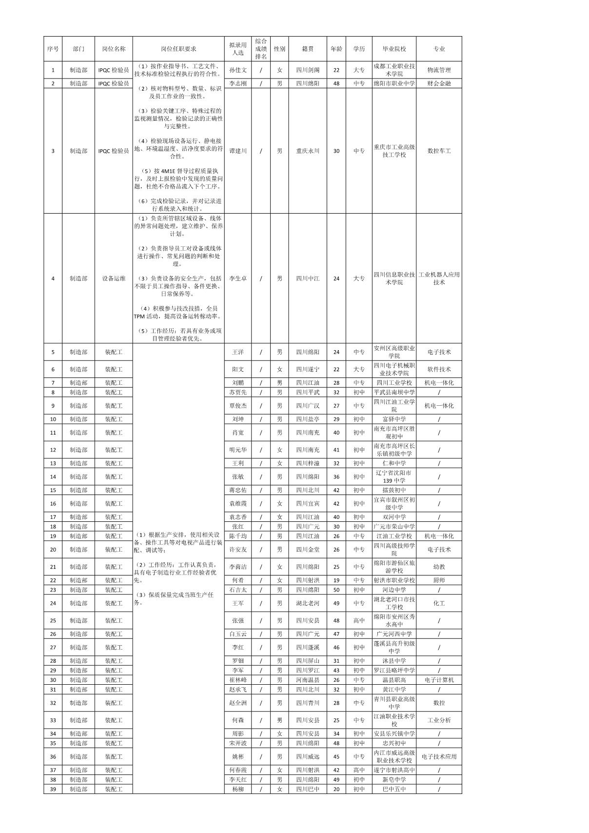 根據(jù)長(zhǎng)虹電器股份有限公司(多媒體)發(fā)布的招聘公告及招聘相關(guān)規(guī)定,經(jīng)面試、考察、體檢等程序,2024年2月擬錄用以下39人到制造部工作,現(xiàn)予以公示,具體情況如下:
