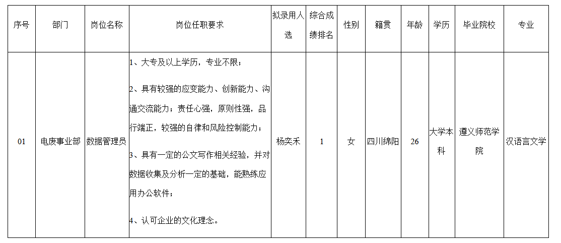 根據(jù)長(zhǎng)虹格潤公司發(fā)布的招聘公告及招聘相關(guān)規(guī)定,經(jīng)面試、背景調(diào)查、體檢等程序,擬錄用楊奕禾同志到長(zhǎng)虹格潤公司工作,現(xiàn)予以公示,具體情況如下: