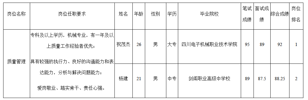 根據(jù)四川長虹技佳精工有限公司發(fā)布的招聘公告及招聘相關規(guī)定,經資格審查、面試等程序,現(xiàn)將測試合格人員予以公示。