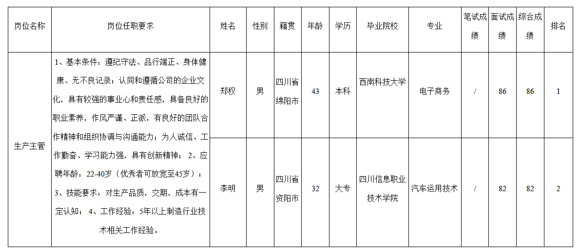 根據(jù)四川九華光子通信技術(shù)有限公司發(fā)布的招聘公告及招聘相關(guān)規(guī)定,經(jīng)筆試、面試等程序,現(xiàn)將筆試(面試)成績予以公示。