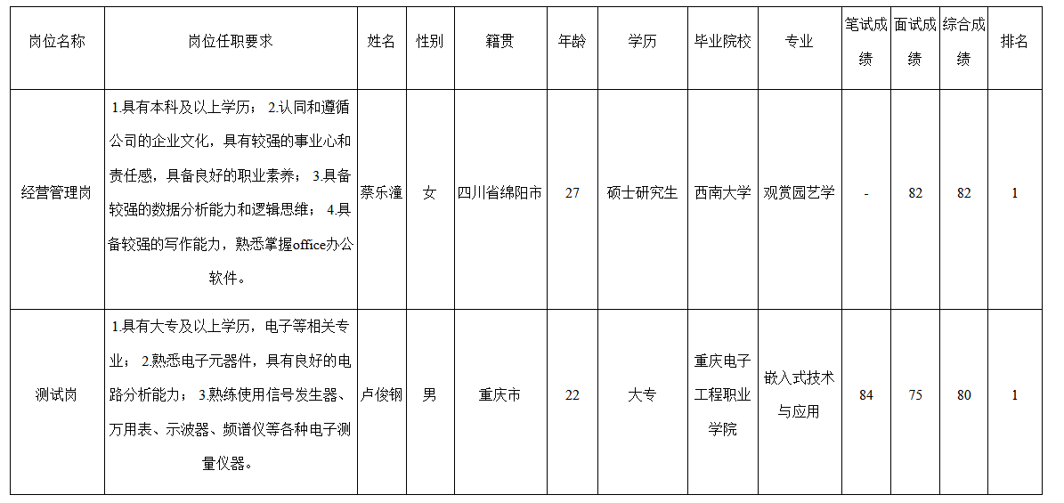 根據(jù)重慶九州星熠導(dǎo)航設(shè)備有限公司發(fā)布的招聘公告及招聘相關(guān)規(guī)定,經(jīng)筆試、面試等程序,現(xiàn)將筆試(面試)成績予以公示。