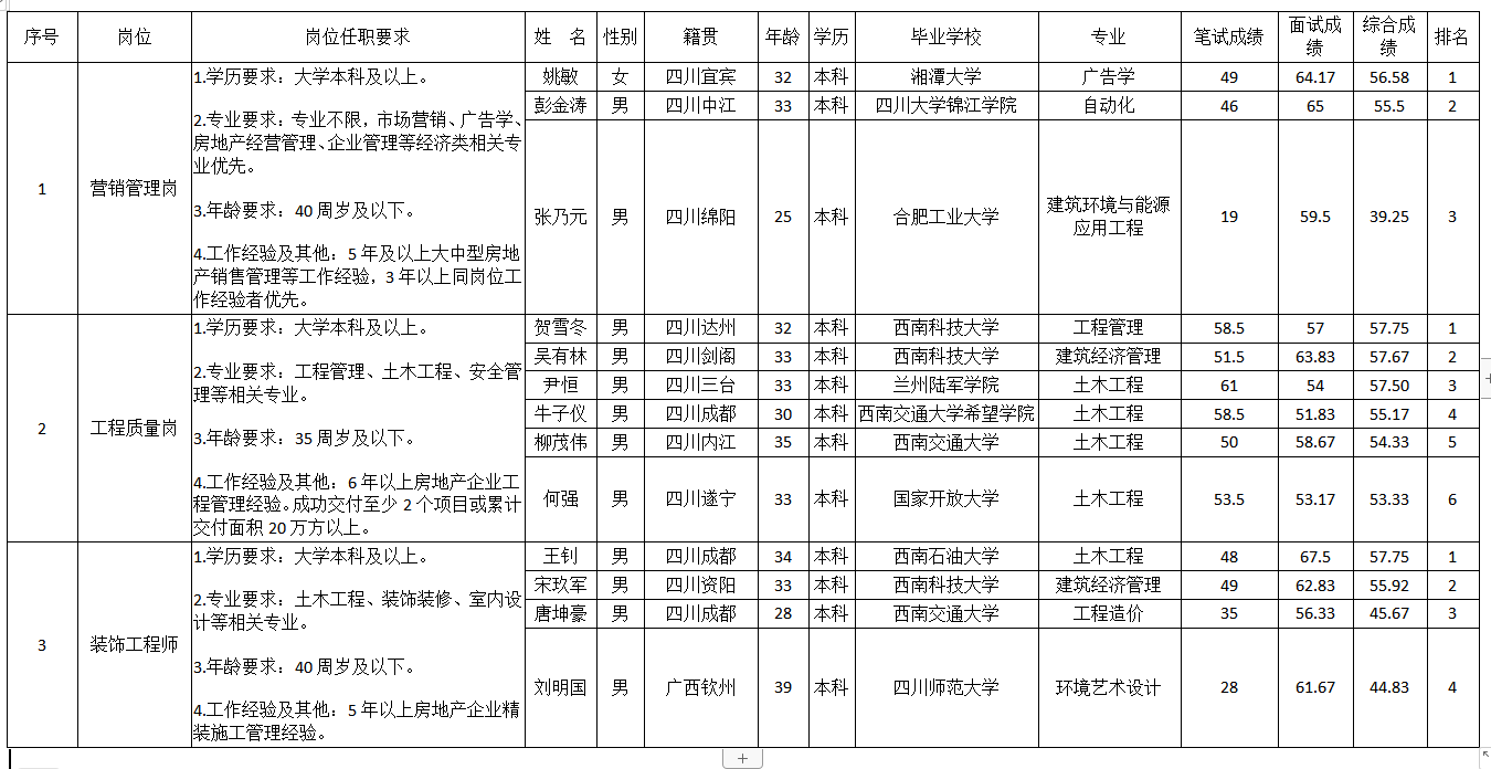 根據(jù)綿陽市綿投置地有限公司發(fā)布的招聘公告及招聘相關(guān)規(guī)定,經(jīng)面試、筆試相關(guān)程序,現(xiàn)將營銷管理崗等3個崗位的綜合考評成績予以公示。