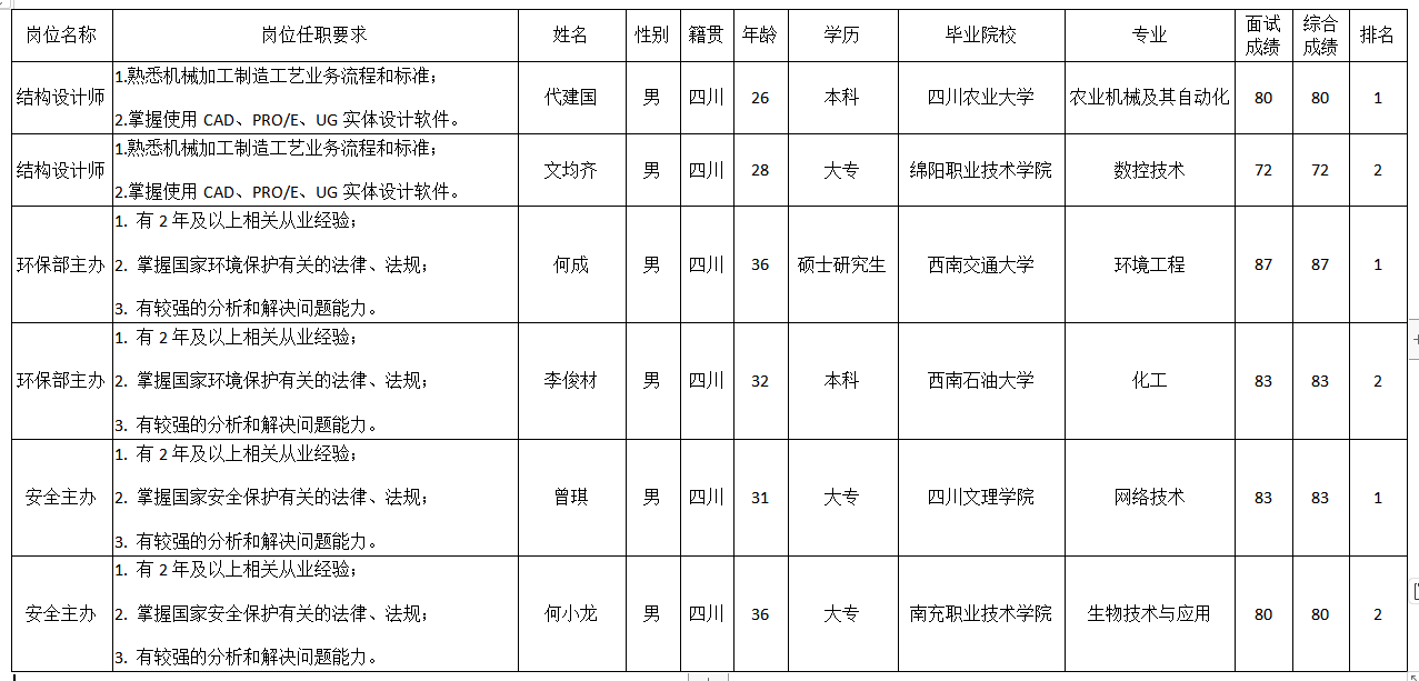 根據(jù)宜賓紅星電子有限公司發(fā)布的招聘公告及招聘相關(guān)規(guī)定,經(jīng)面試等程序,現(xiàn)將面試成績予以公示。