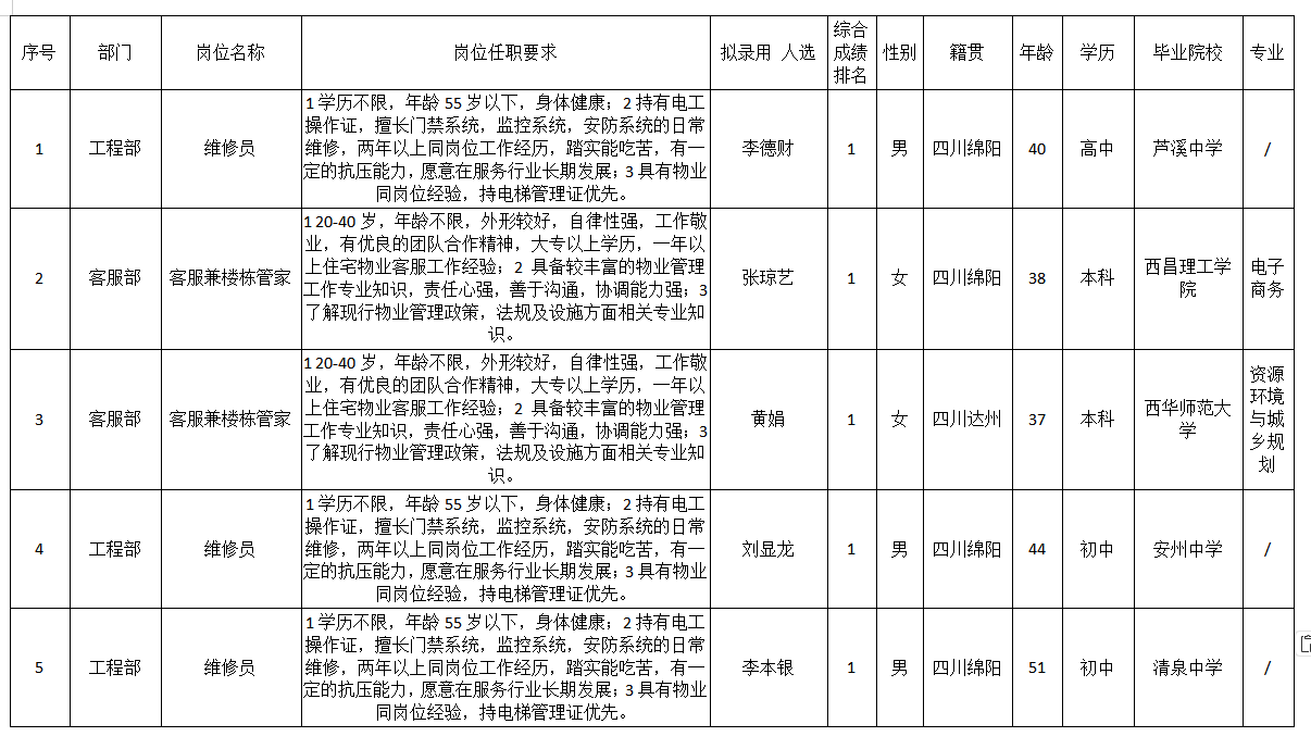 根據四川長虹物業(yè)服務有限責任公司綿陽分公司發(fā)布的招聘公告及招聘相關規(guī)定,經筆試、面試、考察、體檢等程序,擬錄用李德財、張瓊藝、黃娟、劉顯龍、李本銀到安州世紀城、金嶺1號管理處工作?,F(xiàn)予以公示,具體情況如下: