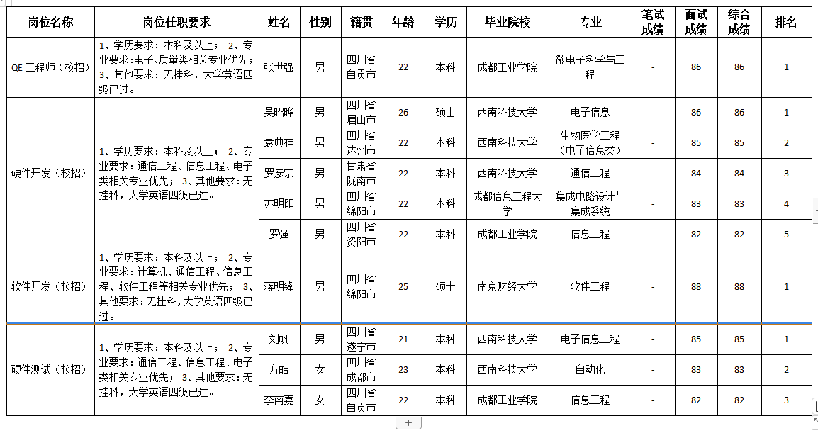 根據(jù)四川九州電子科技股份有限公司發(fā)布的招聘公告及招聘相關(guān)規(guī)定,經(jīng)筆試、面試等程序,現(xiàn)將筆試(面試)成績予以公示。