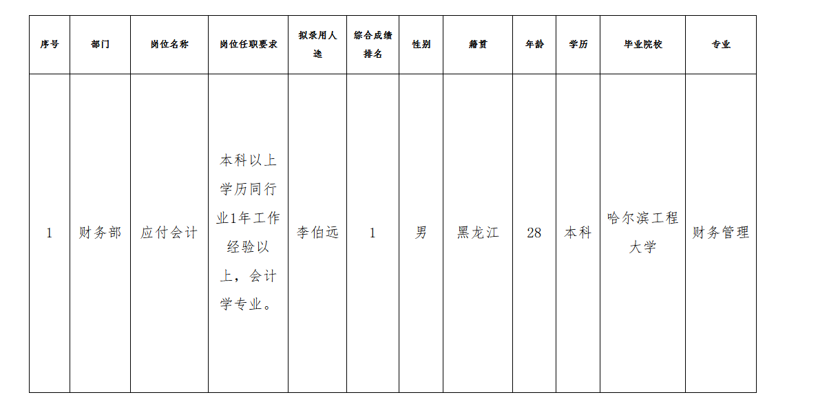 根據(jù)長(zhǎng)虹三杰新能源公司發(fā)布的招聘公告及招聘相關(guān)規(guī)定,經(jīng)筆試、面試、體檢等程序,擬錄用李伯遠(yuǎn)同志到財(cái)務(wù)部工作,現(xiàn)予以公示,具體情況如下: