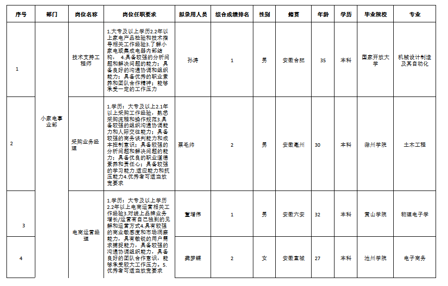 根據(jù)合肥長虹美菱生活電器有限公司發(fā)布的招聘公告及招聘相關(guān)規(guī)定,經(jīng)筆試、面試、考察、體檢等程序,擬錄用孫濤等同志到小家電事業(yè)部工作,現(xiàn)予以公示,具體情況如下: