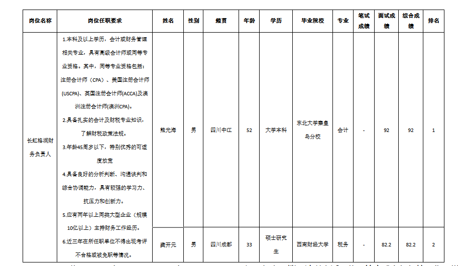根據(jù)長虹控股集團發(fā)布的招聘公告及招聘相關規(guī)定,經(jīng)面試程序,現(xiàn)將成績予以公示。其中,因熊光海較為熟悉長虹產(chǎn)業(yè),與崗位匹配度較高,屬于較為合適人選,根據(jù)崗位任職要求第3點,適度放寬年齡,進入面試環(huán)節(jié)。