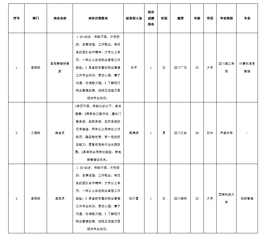 根據(jù)四川長虹物業(yè)服務有限責任公司綿陽分公司發(fā)布的招聘公告及招聘相關規(guī)定,經(jīng)筆試、面試、考察、體檢等程序,擬錄用王平、樊清虎、張汀雪到廣元天匯城管理處、國際城管理處、金嶺1號管理處工作,現(xiàn)予以公示,具體情況如下: