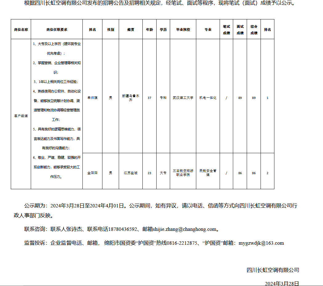 四川長虹空調(diào)有限公司關(guān)于招聘客戶經(jīng)理崗位測試成績的公示